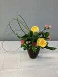 【野いちごの会】 黄色いバラとピンクのカーネーションのアレンジメントを作成されていました。 動きのあるベアグラスが素敵です。 …